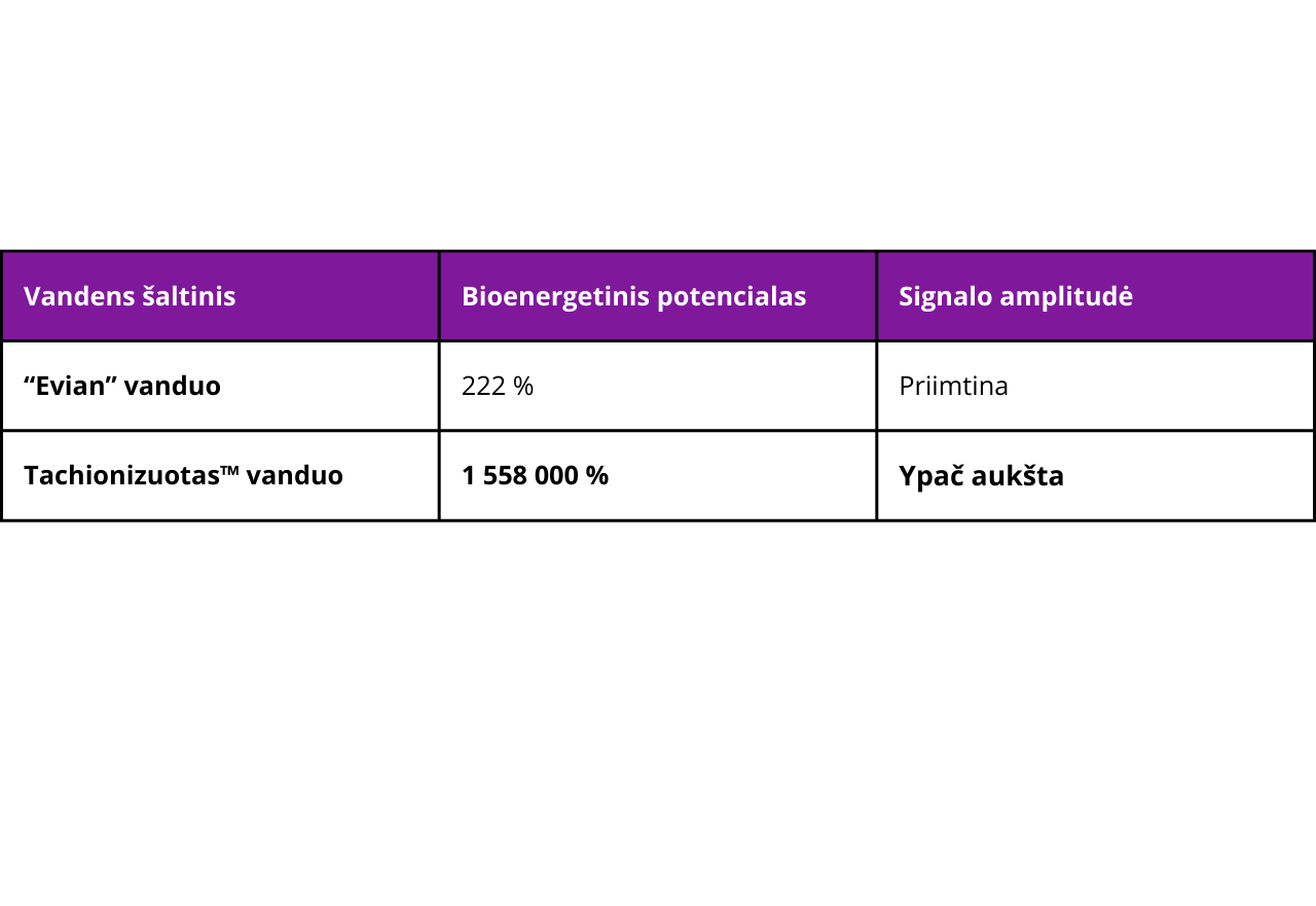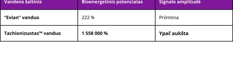 Kvantinis skirtumas tarp Tachionizuoto™ vandens, įkrauto vandens ir Evian
